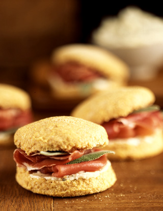 Stuffed Cornmeal Biscuits: Just before serving, split the biscuits open and fill them with thinly sliced scallions (green part only), sliced prosciutto, country-smoked ham, or herbed goat cheese.