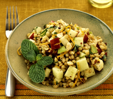 Chewy wheat berries develop a juicy “squish” when marinated briefly in dressing. A citrus dressing is a particularly good complement to the tart green apple and vibrant mint tossed into the mix.